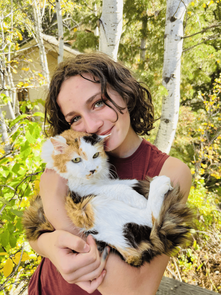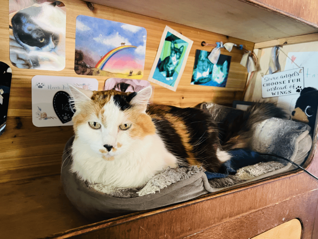Your mere presence made any space perfect. You were our little doll. Your soft fur as white as snow, your fuzzy calico checker butt, your striking colors mixed in with the cutest little face and black nose tip. You made every van trip precious, we still had you and were so incredibly grateful for 2 1/2 more years with you, after Vata went off on his rainbow bridge adventure.